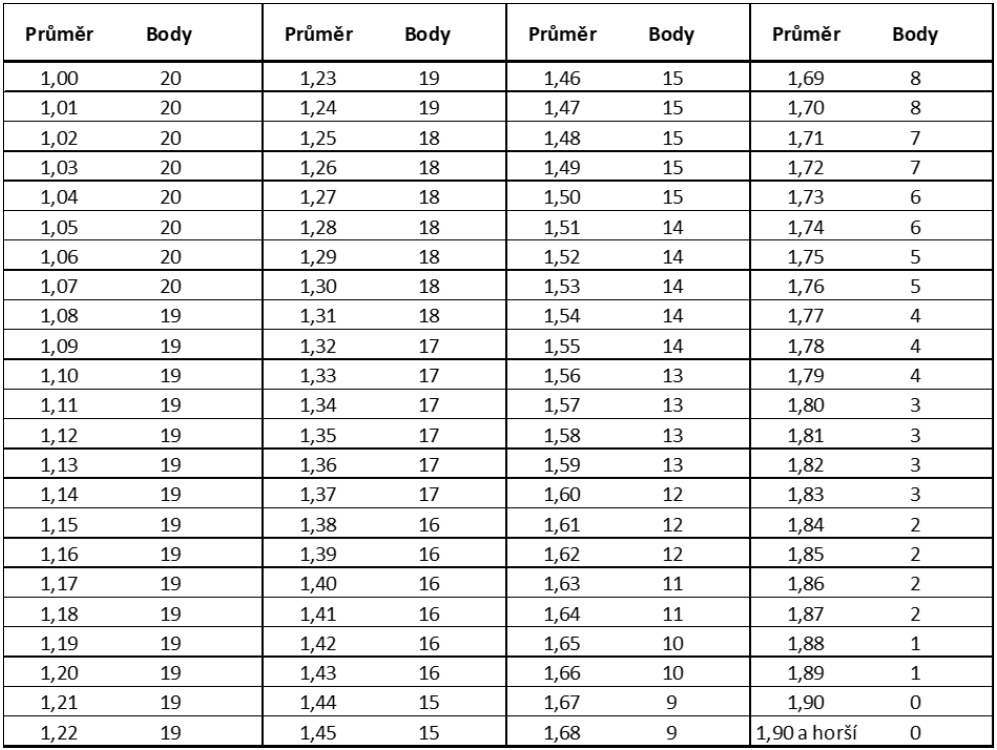 Tabulka bodů za vysvědčení z 8. a 9. třídy